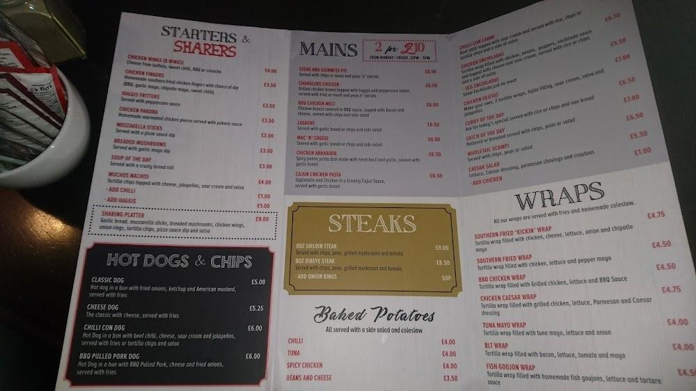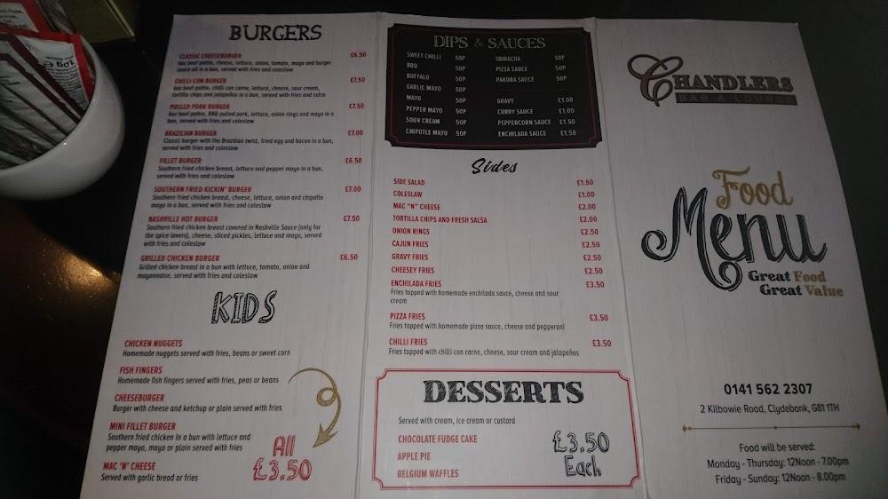 Chandlers sits at 2 Kilbowie Rd, just minutes away from Clydebank's shopping area, making it an ideal spot to unwind after a long day. The pub boasts a wheelchair-accessible entrance and restrooms, ensuring everyone can enjoy its offerings comfortably. With a casual atmosphere that mixes a trendy aesthetic with a cozy feel, it attracts a diverse crowd ranging from tourists to locals looking to mingle. The pub features free street parking, and reservations are accepted—a handy option for busy weekends. At Chandlers, the dining options are versatile; you can choose from an extensive drink menu, dine-in service, or opt for takeaway. The interior has a laid-back feel, enhanced with vibrant decor that invites groups to gather. Whether you're catching a sports game or listening to live music, there’s never a dull moment here. Plus, you can find friendly staff always ready to recommend the best dishes according to your taste.